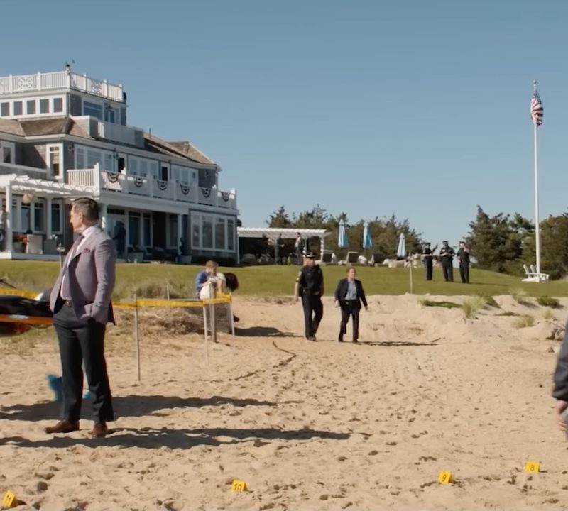 Сцена розслідування злочину на пляжі з мінісеріалу про сімейні таємниці та скелети у шафі.