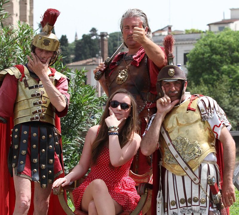 Римські легіонери та дівчина в сучасному одязі в Римі як ілюстрація до теми занепаду Римської імперії та історії латинської мови.