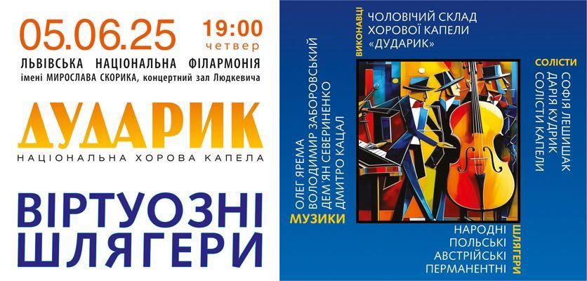 5 червня у Львівській національній філармонії ім. Мирослава Скорика відбудеться концерт, на який з нетерпінням чекають шанувальники справжньої української музики. У межах фестивалю «Віртуози» національна хорова капела «Дударик» представить програму «Віртуозні шлягери» – добірку народних польських, австрійських, а також сучасних авторських пісень, що стали справжніми хітами не одного покоління. Початок концерту о 19:00, зазначають у пресслужбі національної капели «Дударик».