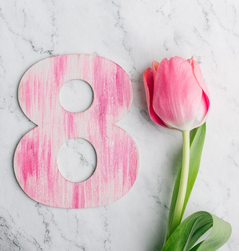 Рожева декоративна цифра 8 та ніжний весняний тюльпан на мармуровому фоні — символ свята 8 Березня.