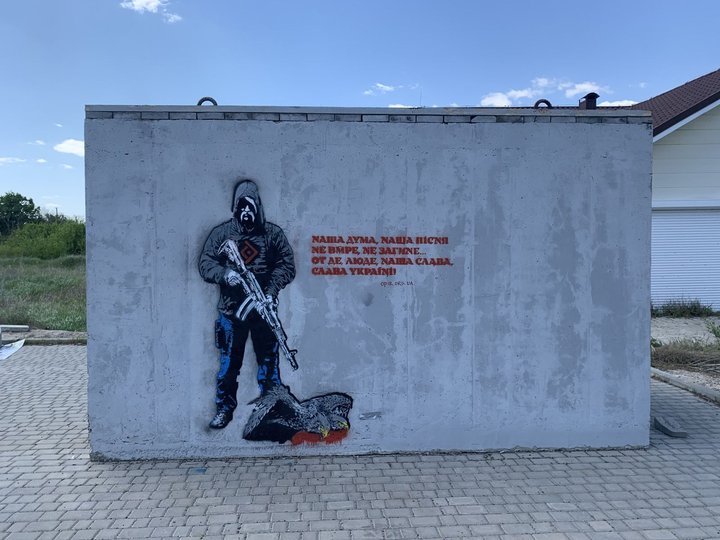 Також Андрій Єрмоленко створив зображення козака з Руху Опору зі знищеним двоголовим орлом. Стінопис поєднує образи сучасного партизана і козака. Крім цього, біля муралу є рядки з вірша Тараса Шевченка: «Наша дума, наша пісня не вмре, не загине. Ось де, люди, наша слава – Слава Україні!».